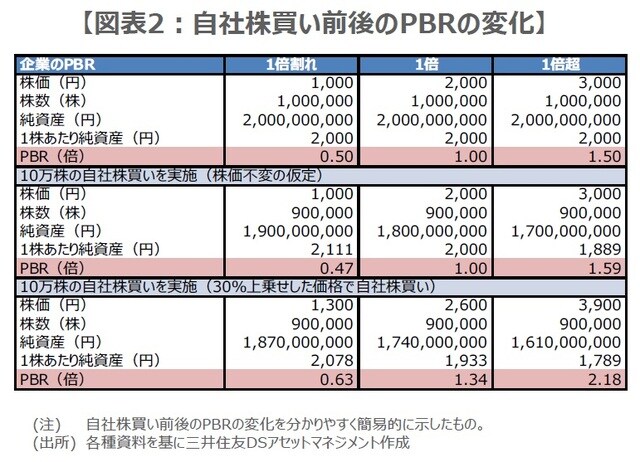 簡単な計算をしたものが図表2です。株価が不変という仮定のもとでは、PBRが1倍割れの企業が自社株買いをした場合、PBRは低下、1倍の場合は不変、1倍超えの場合は上昇という結果になりました。一方、株価に30%上乗せした価格で自社株買いを行ったケースも図表2で示しましたが、このケースでは、自社株買い前のPBRの水準に関わらず、PBRは上昇するという結果になりました。