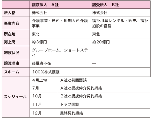 譲渡側のA社は、グループホーム・ショートステイ等、5施設を運営する比較的まとまった、収益もきちっと確保できている東北の介護事業会社です。社長の年齢が75歳となり、後継者問題を抱えていました。というのも、2人のご子息はそれぞれ会社を経営しており、承継の意思はなく、社長も無理に継がせたくはないと考えていました。