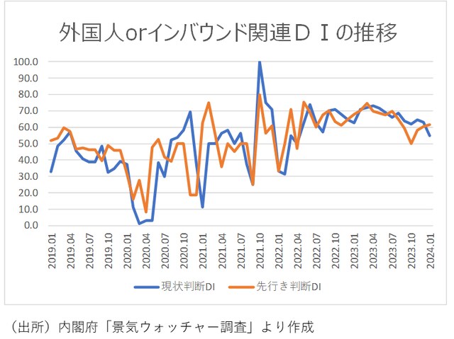 一方、先行き判断で「外国人orインバウンド」関連DIは、22年4月の46.9以来18ヵ月ぶりの50割れになった10月49.9から、上昇に転じ、11月58.1、12月60.4、1月61.4と改善してきました。
