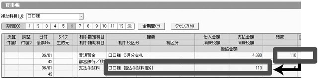 STEP 2:「買掛帳」で、残っている振込手数料相当額を「支払手数料」に振り替えます。この例では振込手数料相当額110円が残っているので、これを「支払手数料」で振り替えます。