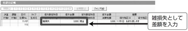 ②代金をもらいすぎたりお釣りを渡しすぎたり、個人の財布が関連しない記録もれや記録ミスの場合は、「雑収入」「雑損失」勘定で処理。