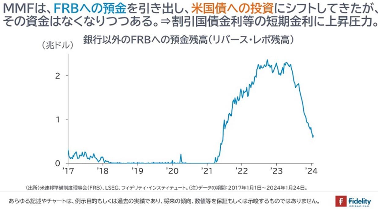 そして、銀行のほかに、FRBが流動性を吸収できる主体(=FRBが供給した流動性を保有する先)はMMFです。しかし、[図表2]に示すとおり、②そのMMFがFRBに預けるリバース・レポの残高(=銀行以外の主体によるFRBへの預金)もゼロに近づきつつあります。