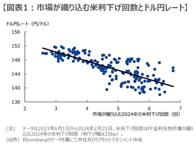 特に米早期利下げ観測の後退は、ドル高要因としてドル円に大きく作用したと推測されます。図表1は、フェデラルファンド(FF)金利先物市場が織り込む2024年の利下げ回数とドル円レートの関係を示したものですが、利下げ1回の織り込み減少で2円61銭ほどドル高・円安が進むことが示唆されています。利下げの織り込み回数は、年初の6回から直近は3回まで減少したため、約7円83銭のドル高・円安要因と判断されます。