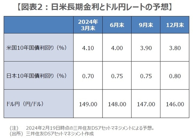日銀の金融政策については従来通り、4月にマイナス金利の解除で異次元緩和は終了、年内は利上げなしとの予想です。これらを踏まえ、年末に向かって米国の10年国債利回りは緩やかに低下する一方、日本の10年国債利回りの上昇は小幅にとどまるとみており、日米10年国債利回り格差が縮小に向かうことでドル円も緩やかにドル安・円高が進行し、年末の着地水準は現時点で146円を見込んでいます(図表2)。