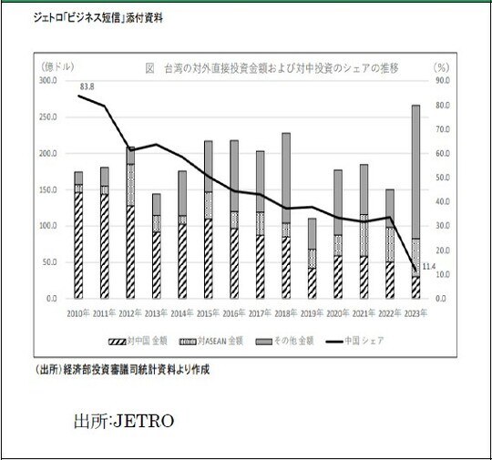 台湾の対中直接投資は23年に前年比39.8%減少し、30.4億ドル(4,560億円)だった。一方、日本の財務省によると、台湾の対日投資は2,697億円と前年比46.9%の急増となった。