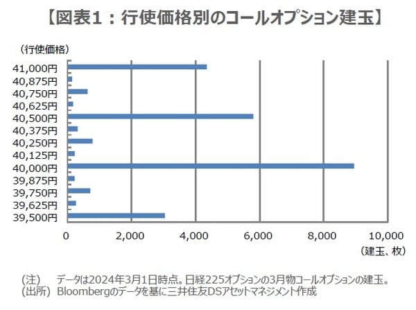 そこで、日経225オプションに目を向けると、3月物コールオプションは3月1日時点で行使価格40,000円の建玉(たてぎょく、未決済残高のこと)が、大きく積み上がっていることが分かります(図表1)。そのため、例えば日経平均が40,000円を超えて上昇すると、行使価格40,000円のコールオプションの売り手には損失が発生することから、売り手は別途、日経225先物を買って、「デルタヘッジ」を行うことがあります。