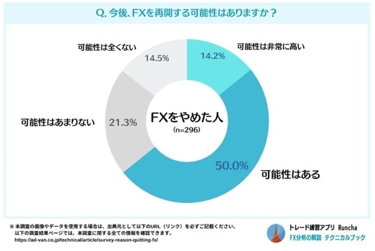 FXをやめた人に再開する可能性について質問したところ、「可能性は非常に高い/可能性はある」と回答した人は64.2%、「可能性は全くない/可能性はあまりない」と回答した人は35.8%という結果となりました。FXをやめたとしても、半数以上の人が再開について前向きに考えているようです。