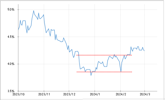 こういったなかで、米長期金利の10年債利回りは、年末年始から続いた4%前後での小動きのレンジを上抜けるところとなりました(図表2参照)。