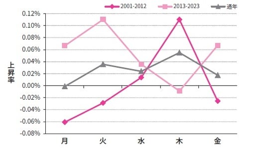 【図表1】は、2001年1月~2023年6月の曜日ごとの日経平均上昇率の平均を表したグラフです(期間を分けた場合であっても同じ傾向が見られるか確認するため、さらに期間をアベノミクス前(2001年1月~2012年12月)とアベノミクス後(2013年1月~2023年6月)に区切っています)。