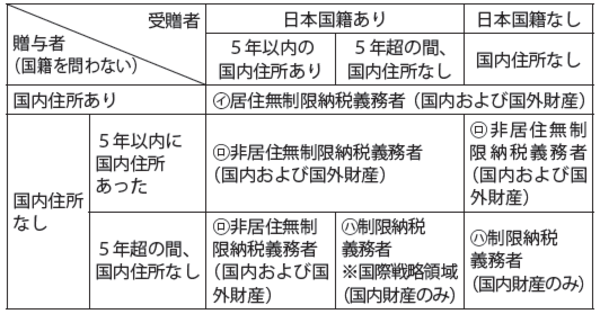 受贈者が、財産を贈与されたときに「国内に住所あり」の場合、その課税関係は、贈与者の国籍を問わず、受贈者は「㋑居住無制限納税義務者」として、所在地を問わずすべての贈与財産に日本の贈与税制が適用になります。