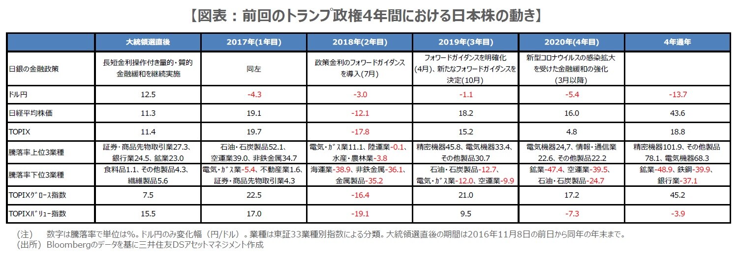 今週のレポートでは、トランプ前政権で米国株、日米長期金利、ドル円がどのように動いたかを検証しました。今回は日本株の推移を振り返り、改めて米大統領選挙でトランプ氏が勝利した場合の市場への影響について考えます。まず、日本株について結論から申し上げると、トランプ前政権の4年間において、基本的には米国株と同じ動きがみられました。以下、詳しくみていきます。