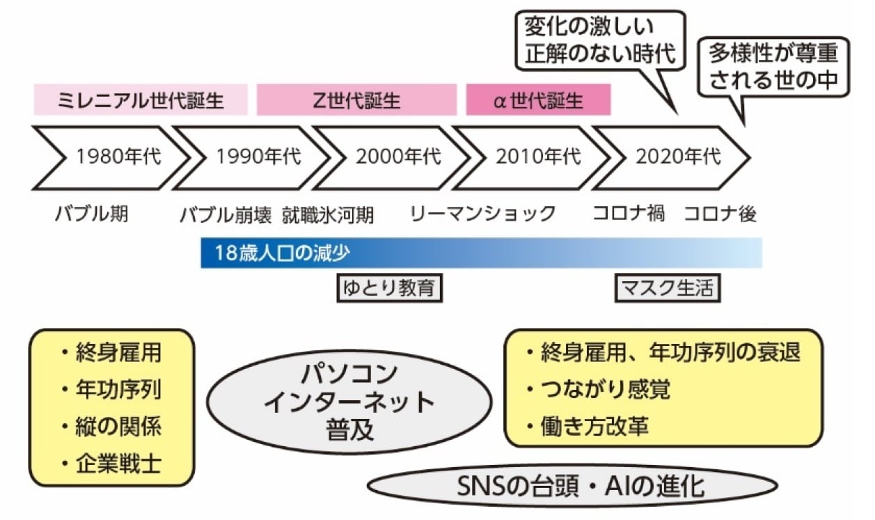 バブルが崩壊し、大手企業も倒産する現実を目の当たりにし、不景気な時代が到来。パソコンやインターネット、AIといったテクノロジーの進化で世界がつながるようになり急速にグローバル化していきました。