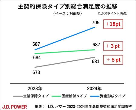 資産形成タイプの商品の満足度が向上している。保険会社営業職員部門および保険代理店部門を合わせた「対面型」では前年調査(2023年3月発表)と比較して+18ptの大幅な向上が見られ、ファクター別でも全てにおいて向上が確認された。