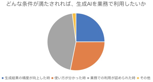 アンケートで「どんな条件が満たされれば業務で利用したいか」と質問したところ、最も多かったのは「業務での利用が認められた時」が44.8%だった。一部の生成AIで情報流出があったことから、業務での利用を認めていない企業もあるためとみられる。