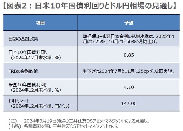 現状、日銀の次の一手は「利上げ」、FRBは「利下げ」と予想されるため、その織り込みが進めば、10年国債利回りは日本で上昇、米国で低下、ドル円は日米金利差縮小からドル安・円高の進行が見込まれます(図表2)。ただ、弊社は日銀の利上げは年内行われず、FRBの利下げは年内2回とみているため、ドル安・円高の動きは限定的なものとなり、また、日米とも金融政策に波乱がない限り、株価は年内底堅い推移が続くとみています。