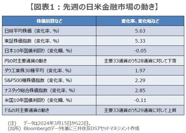 ●先週、日銀はマイナス金利解除を決定、FRBは政策据え置きを決め年3回の利下げ予想を維持。