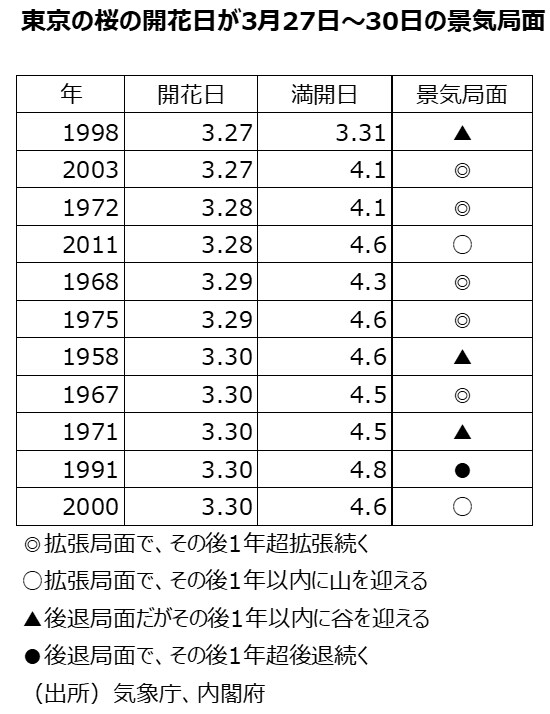 1953年から実施されている気象庁の生物観測調査で、東京の桜の開花が3月20日以前と早い年は過去12回ありますが、コロナ禍の影響が出た2020年を除き、早く春が来ると春物が売れることなどから、全て景気は拡張局面に当たります。しかし、開花が遅い今年はこのケースには当てはまりませんでした。