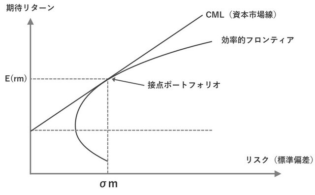 最も効率的なリスク資産のポートフォリオは、「接点ポートフォリオ」であり、投資家はこの接点ポートフォリオと無リスク資産の割合のみを決定するものと考えられます。この考えはトービンの分離定理として知られています。