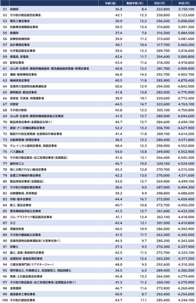 職業別「平均年収」ランキング…男性51~100位