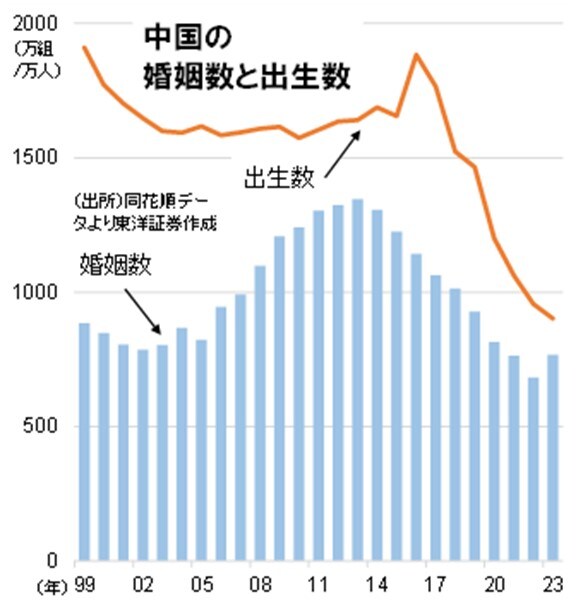 社会的および文化的観念などから婚外子が避けられる、つまり「結婚してから子どもを産む」のが一般的な中国では、婚姻数の増減が新生児の数と密接に関係してくる。