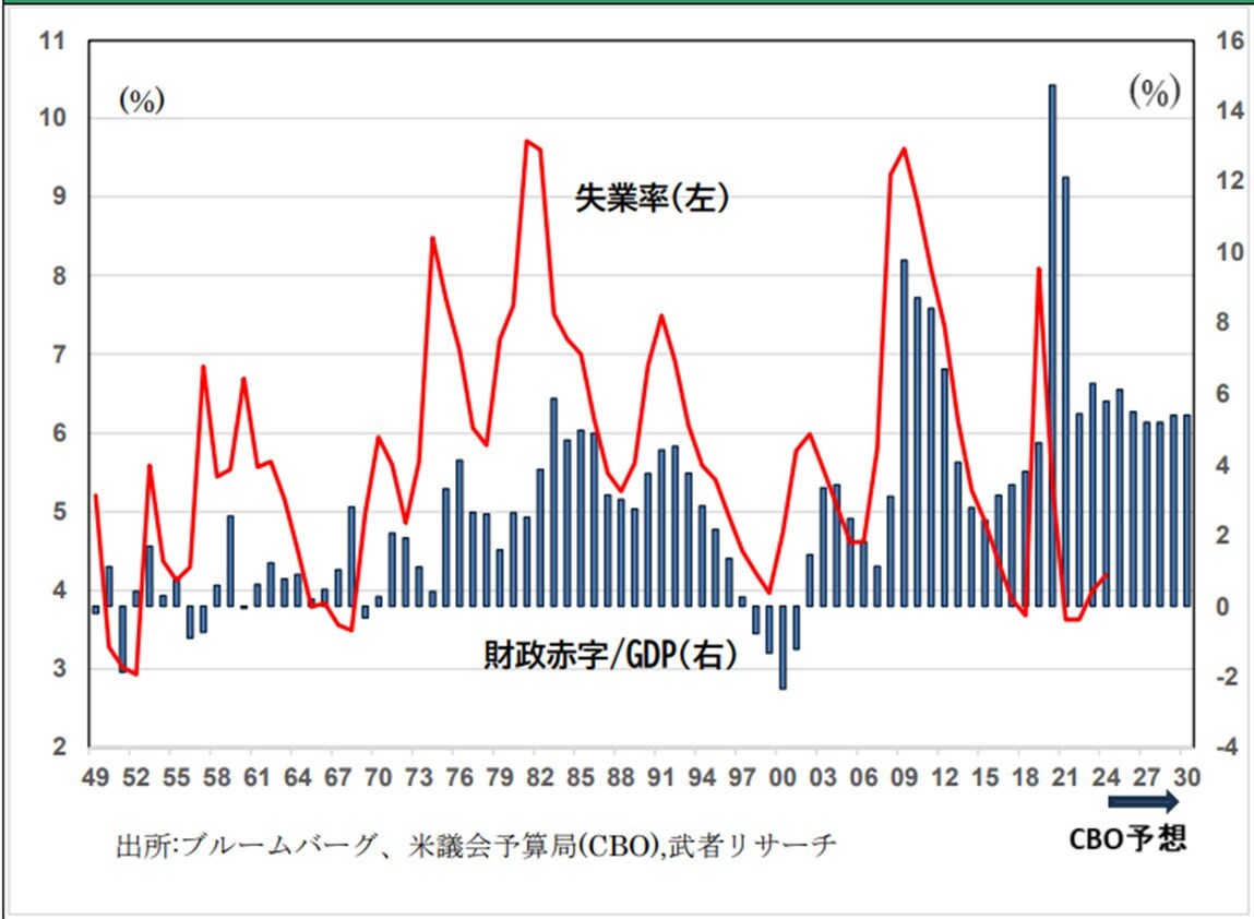 かつては財政赤字は失業率が高まったときに、需要創造手段として繰り出されたために両者はほぼ完全に連動していた。しかし2021年以降完全雇用状態が続いているのに、財政赤字が減る気配はまったくない。議会予算局(CBO)は対GDP比5~6%の主要国最高水準の財政赤字が2034年まで定着すると予想している。