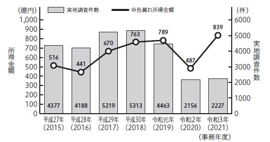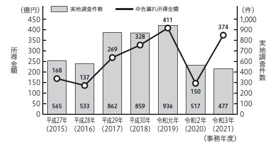 務年度(2021年7月〜2022年6月)に計2,227件の実地調査が行われ、1件あたりの申告漏れ所得金額は過去最高の3,767万円、1件あたりの追徴税額も過去最高の1,067万円となりました【図表2】。