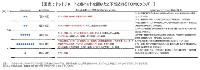 以上より、今回のFOMCは、インフレを注視しつつ政策金利は当面維持という、おおむね想定内の結果になる可能性が高いと思われます。なお、弊社はドットチャート(前回3月公表分)について、FOMCメンバーの誰がどの水準にドットを置いたかを予想しており(図表)、年内25bpの利下げを3回予想している9名には、パウエル議長やジェファーソン副議長らが含まれるとみています。