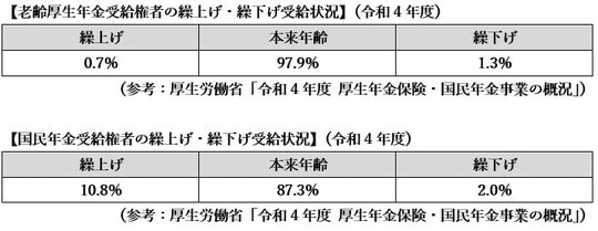 参考までに、昨年末に公表された「令和4年度 厚生年金保険・国民年金事業の概況」(厚生労働省)から、年金の繰上げ・繰下げ受給の状況をみてみると、繰上げや繰下げをしている方はそれほど多くありません。