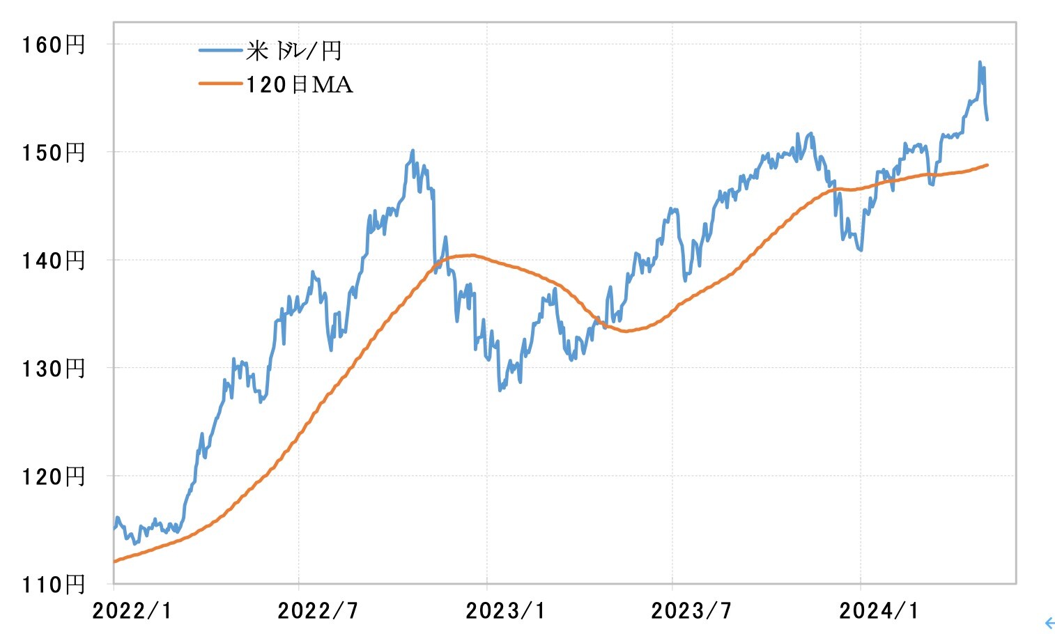 以上を踏まえると、円安をリードした投機筋の米ドル買い・円売りは、米ドル/円が120日MA以上で推移しているなかでは続く可能性があり、撤退が本格化するためには、少なくとも120日MAを継続的に割れる見通しが必要ではないでしょうか。ちなみに、そんな120日MAは、足下で148.7円程度です。