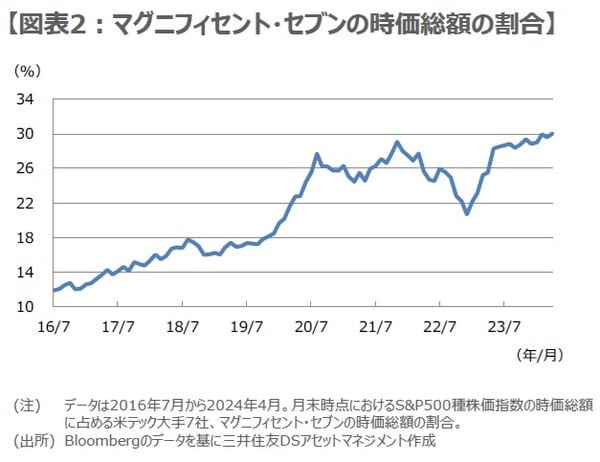今は米国のインフレの粘着性が株価の上値をおさえる一因となっていますが、インフレが鎮静化していけば、市場の関心は企業業績に移り、株価は徐々に水準を切り上げる展開も想定されます。なお、前述の米テック大手7社の時価総額は、4月末時点でS&P500種株価指数の時価総額の30%を超え(図表2)、これら7社の株価動向がS&P500種株価指数に大きな影響を与えることもあるため、この点には注意が必要です。