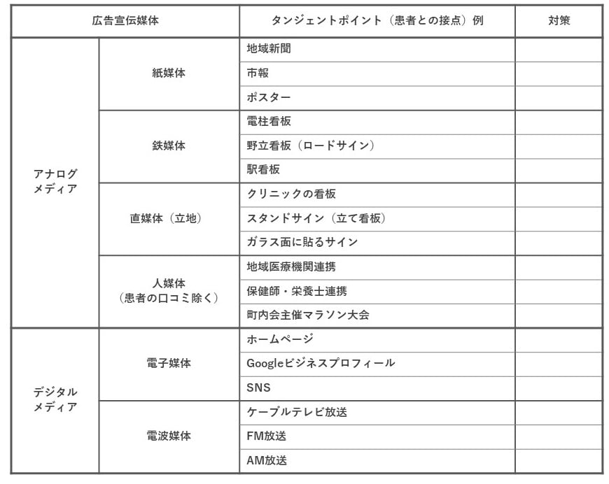 そこでまず、図表3を参考にして、それぞれ患者さまをつなぐ接点となる具体的な媒体をピックアップしていきます。
