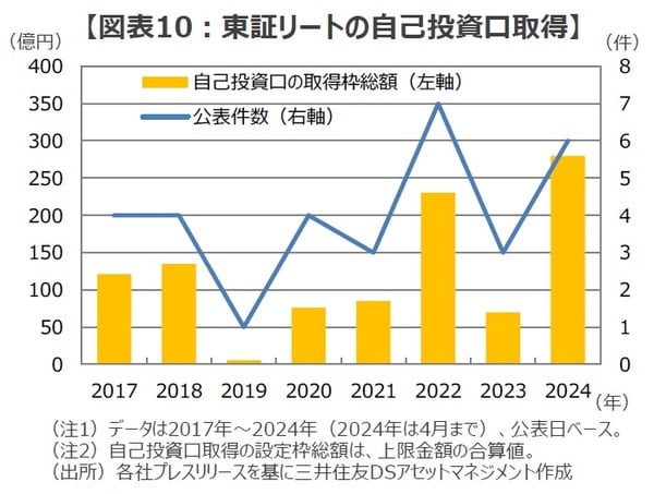 ■日本のリート市場においても、NAV倍率が1倍を下回る銘柄を中心に、自己投資口取得を公表する動きが加速しています。24年に入り、計6件の自己投資口取得の決定が公表され、その総額(上限金額の合計)は、4月末時点で280億円と年間ベースの過去最高を既に更新しています(図表10)。前述の通り、ファンダメンタルズが改善傾向にある一方で、東証リート指数は23年以降NAV倍率1倍割れの状態が続いており、今後も資本効率の向上や投資主還元を目的としたアクションが、日本のリート市場の下支えとなりそうです。