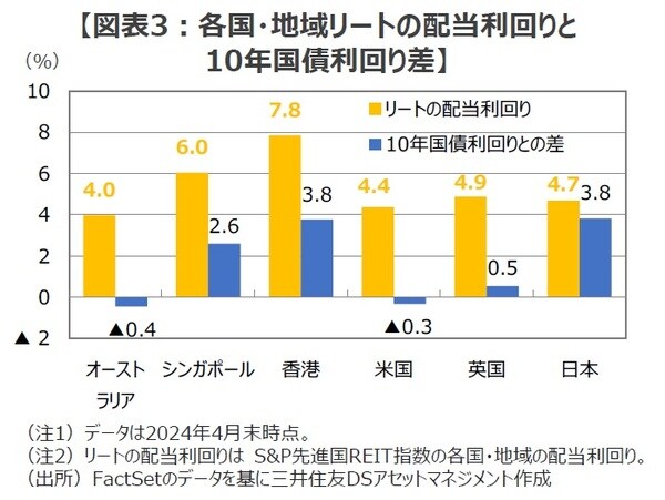■リートは、保有している不動産からの賃貸収入や売却益から得られる配当収入が安定的に期待できる金融商品ですが、直近の配当利回りはグローバル平均で4.6%程度(S&PグローバルREIT指数、24年4月末時点)と比較的高い水準にあります。