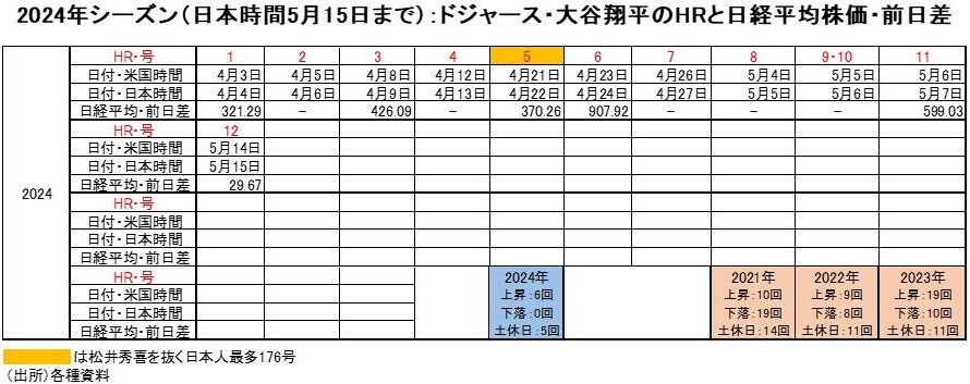 日本時間5月15日、ロサンゼルス・ドジャースの大谷翔平選手が6試合ぶりに、サンフランシスコ・ジャイアンツ戦でナ・リーグ最多タイに並ぶ第12号ソロホームランを打ちました。3月20日の韓国での開幕戦直前の日経平均株価は3月19日終値の40,003円60銭でしたが、5月15日の終値は38,385円73銭で、▲1,617円87銭低下しています。日経平均株価は概ね低下局面と言える中、今シーズンは、5月15日現在、大谷選手がホームランを打った日は、これまで日経平均株価が下落したことが一度もないという興味深い現象が続いています。