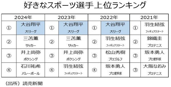 「読売新聞スポーツ世論調査」では好きなスポ―ツ選手のランキングも発表しています。大谷翔平選手は22年の調査で、初めて第1位になり、今年・24年まで3年連続で第1位になっています。この調査は好きなスポーツ選手を3人まで自由に書く方式で、24年では大谷選手が634票と過去最高の票を獲得、2位の76票を大きく引き離しています。22年は大谷選手397票、2位165票でした。23年では大谷選手444票、2位78票でしたので、年を経るごとに大谷選手の人気が一段と高まってきた感があります。