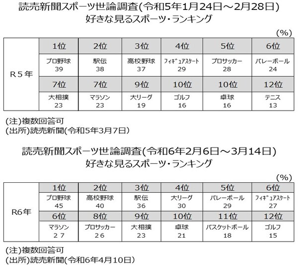 毎年1~3月頃に実施されている「読売新聞スポーツ世論調査」で、好きな見るスポーツのランキングで毎年の第1位は「プロ野球」ですが、「大リーグ」が23年に第9位とベストテンに入り、今年・24年は「大リーグ」が第4位まで上昇しました。