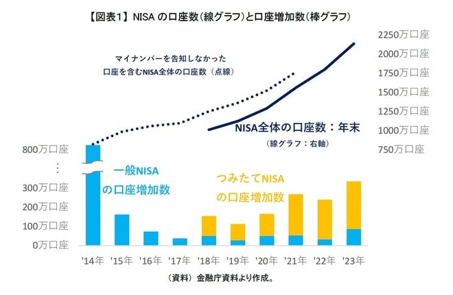 2024年からいわゆる新NISAとして大幅に制度拡充されて生まれ変わった少額投資非課税制度(NISA)。NISAの口座数(線グラフ)は2023年末時点だと一般が1,161万、つみたてが974万、全体で2,136万になっています(図表1)。口座の増加数(棒グラフ)は2023年につみたてNISAを中心に335万口座増え、2021年の268万口座を上回り一般NISAの開始年の2014年を除くと最大となりました。