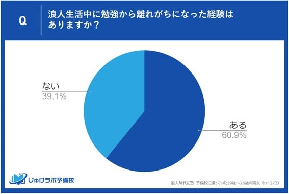 勉強に対する高い志が求められるのは、医学部志望以外の受験生も同じです。特に浪人生は勉強の質と量を維持することが求められます。ところが、浪人経験のある373人(19歳〜26歳)を対象にじゅけラボ予備校が実施したアンケート調査によると、浪人生の60.9%が「勉強から離れがちになった経験がある」と回答しています。