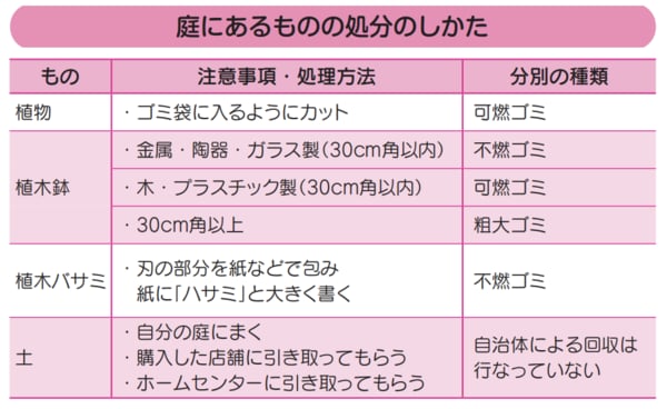なお、木は根元に近いところから切り、それ以降の片づけは業者に任せるのがおすすめです。庭にあるものの処分のしかたを表にまとめましたので、参考にしてみてください。
