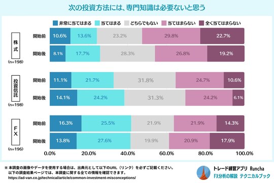 開始前における「専門知識は必要ない」と 考える人の割合は、株式が24.2%、投資信託が32.8%、FXが41.8%でした。一方、「専門知識が必要」と 考える人の割合は、株式が52.5%、投資信託が35.4%、FXが36.2%でした。