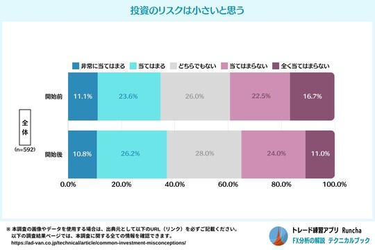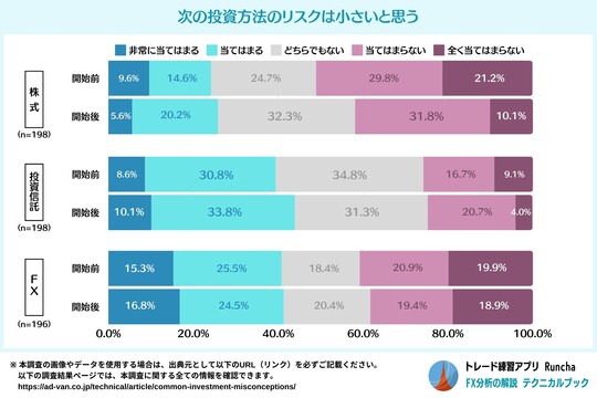 開始前における「リスクは小さい」と 考える人の割合は、株式が24.2%、投資信託が39.4%、FXが40.8%でした。一方、「リスクが大きい」と 考える人の割合は、株式が51.0%、投資信託が25.8%、FXが40.8%でした。