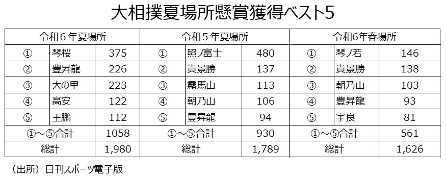 ■初優勝した小結大の里の獲得懸賞は223本。第3位の多さ