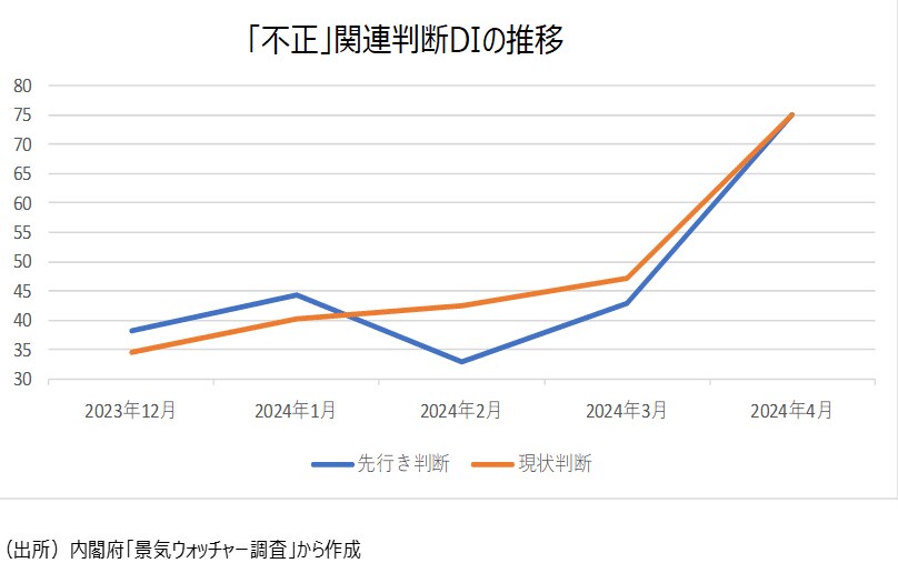 『景気ウォッチャー調査』で不正検査による一部自動車会社の生産停止の影響をみてみましょう。23年11月では「不正」というワードを使用した景気ウォッチャーは皆無でした。12月には現状判断で17名、先行き判断で26名「不正」というワードを使ったコメントが出ました。関連判断DIを作成すると、現状38.2、先行き34.6と30台の悪いDIとなりました。