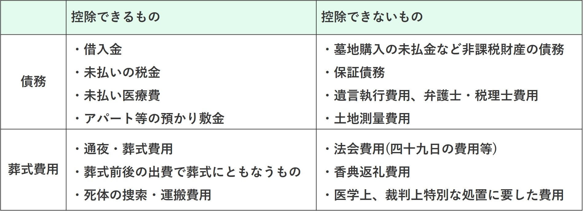 被相続人の残した債務は債務控除として、資産合計から差し引かれることになります。これには銀行の借入金や未払い税金などが含まれます。また、葬式費用も控除対象で、お通夜や告別式などの費用が含まれます。