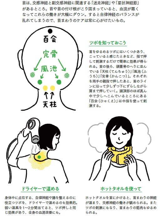 そこでおすすめなのが、首まわりのケアやツボ押しです。首には自律神経に重要な関連をもつ神経があるため、首のこりは血流の悪化を招き、神経の働きをダウンさせて自律神経の乱れにつながるのです。逆に言えば、首まわりをほぐしていい状態を保てば、自律神経が整い、腸にも好影響が期待できます。