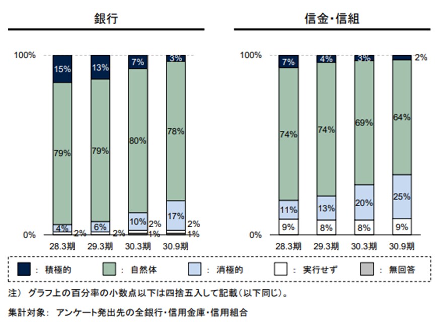 平成30年の「かぼちゃの馬車」事件の発生から金融機関の融資スタンスは「積極的」が減り、「消極的」が増加している。