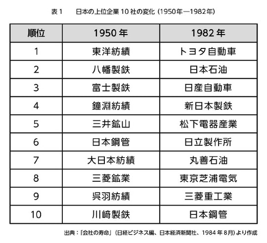 ランキングの上位100社に入るようなトップ企業であっても、その地位を保てる期間は30年以下にすぎない、ということで大きな話題になりました。1950年と1982年の上位10社を示したのが図表1です。