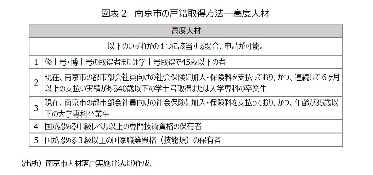 これまで実施されていた高度人材による申請は、大学卒業以上の学歴または高度な技術を持つ45歳以下を対象としており、南京市が必要とする人材を優先している点がうかがえる(図表2)。