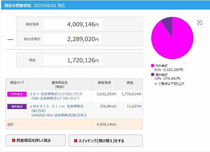 なぜiDeCoも楽天証券ではないのかというと、iDeCoを始めた当時はSBI証券のほうが楽天証券より低コストのインデックスファンドが充実していたからです。そして、以前は「SBI・全世界株式インデックス・ファンド」に掛金を全額拠出していましたが、信託報酬が引き下げられた「eMAXIS Slim全世界株式(除く日本)」に途中で変更しています。