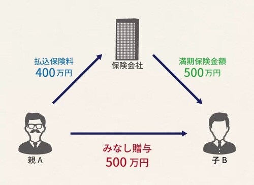 この場合には、保険料の全てを親Aが負担しているため、子Bが受け取った満期保険金額500万円の全額がみなし贈与課税の対象となります。
